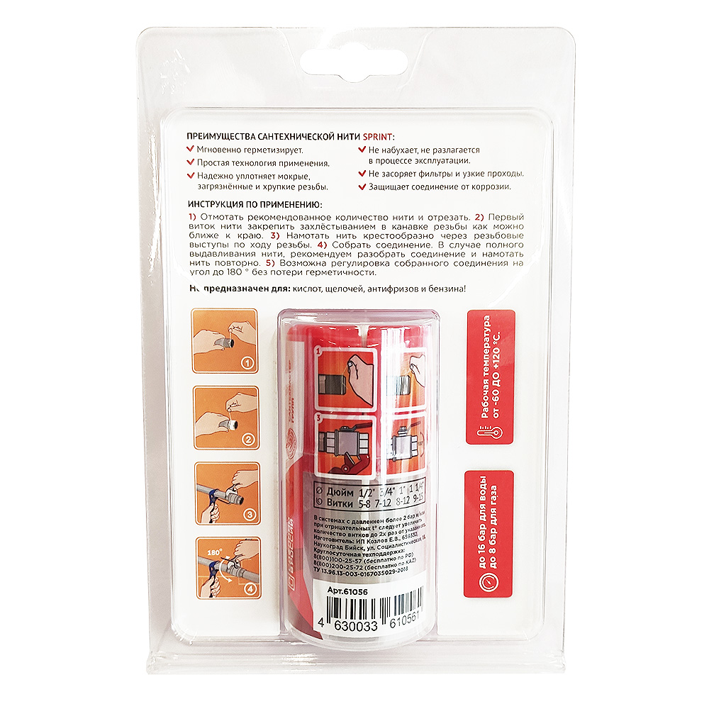 Плоское сечение нити позволяет подматывать резьбу равномерно и плотно, благодаря чему резьба идеально герметизируется моментально после затяжки соединения. А уникальный состав пропитки для нити SPRINT защищает металлические резьбы от коррозии на долгие годы.