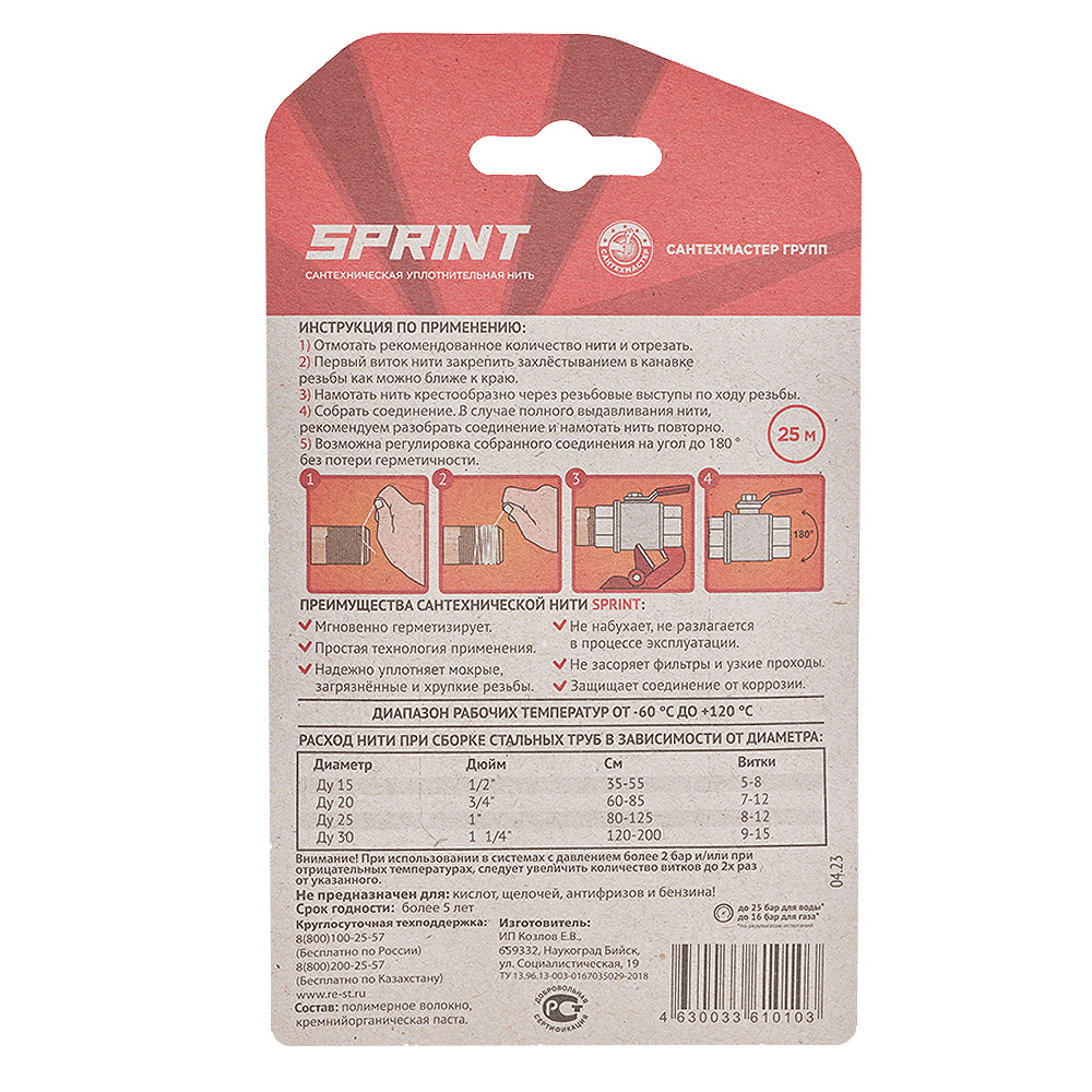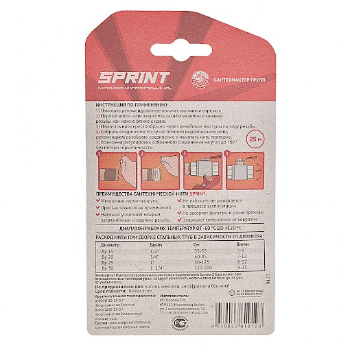 Обращение с этой нитью не требует особых инженерных или технических навыков. Резьбу перед намоткой этой универсальной нити для герметизации не нужно специально подготавливать. Нить SPRINT хорошо ложится на мокрую, грязную или ржавую поверхность.
