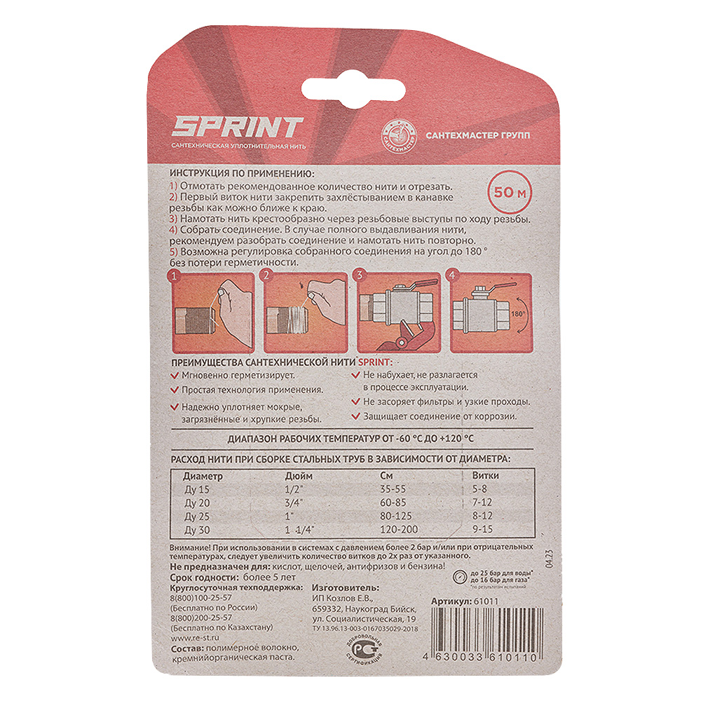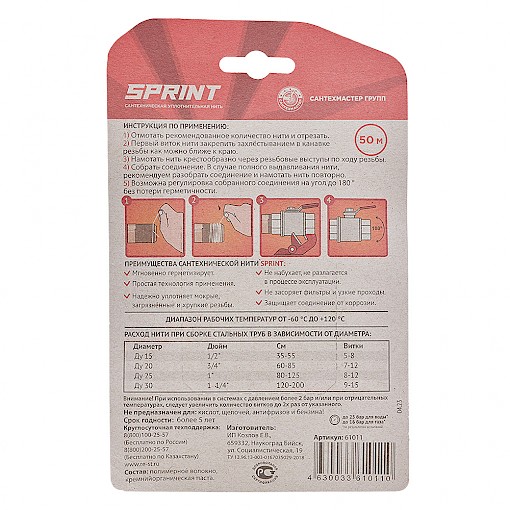 Резьба с такой подмоткой остается герметичной на долгие годы, она не разрушается при сильных вибрациях и выдерживает повороты резьбовых соединений на угол до 180º при необходимости регулировки. Нить SPRINT идеально подойдет для срочного ремонта или быстрого монтажа, ведь в обращении с ней не требуется специальных навыков. Перед применением этой сантехнической уплотнительной нити резьба не нуждается в предварительной подготовке — SPRINT надежно герметизирует мокрые, загрязненные, ржавые и частично разрушенные резьбы.